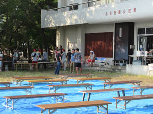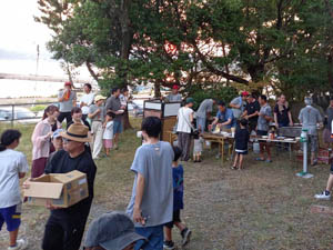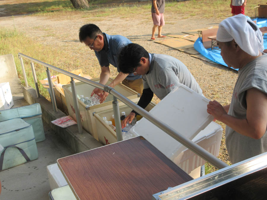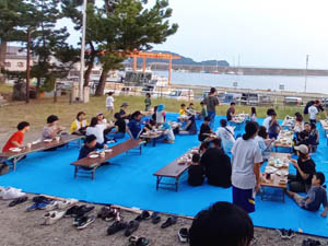 猛暑が続いていて、夕方からのスタートです。100人近くの参加者があり、楽しみました。焼きイカ、焼きそば、かき氷、等々がでて、猛暑に負けずと和気あいあいと歓談し、町内の子供との交流を楽しみました。