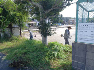 観音堂近くに防災資機材庫が置いてある空き地の草刈りです。いざという時に近づけないと大変です(筆者撮影)